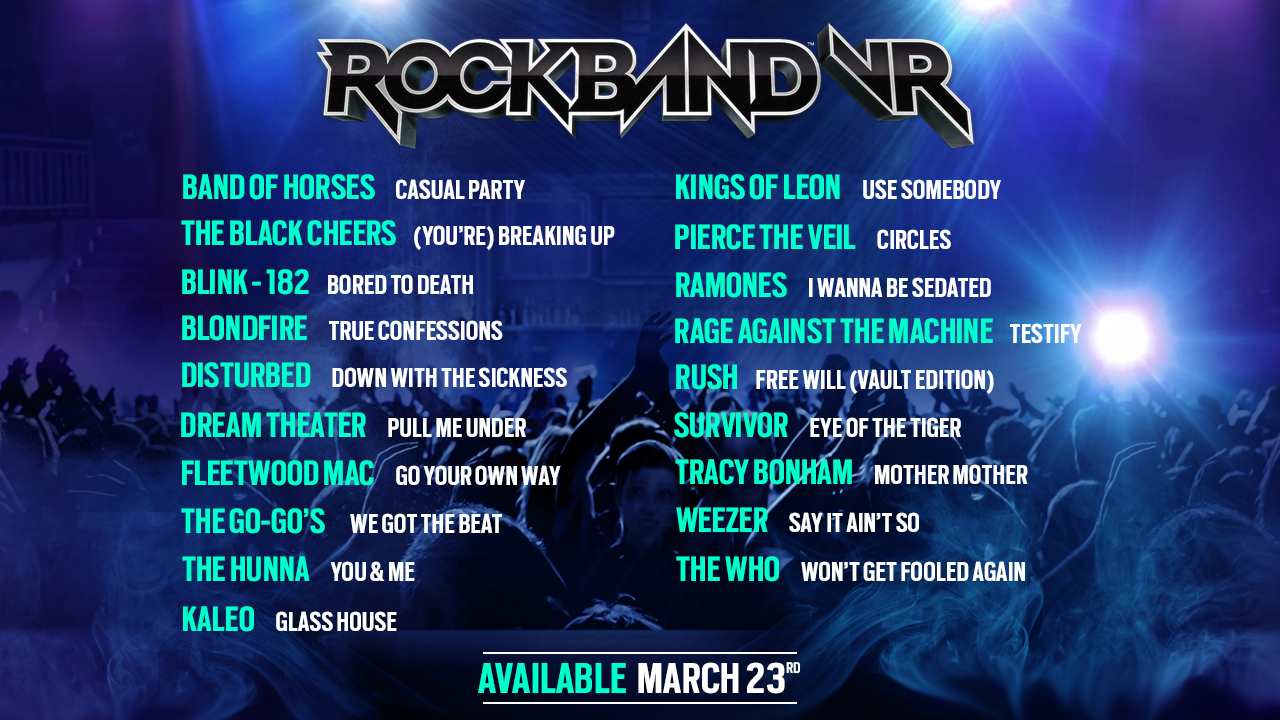 To celebrate the impending release of Rock Band VR, we’re releasing several of the songs from the setlist as Rock Band 4 DLC! Check out Rock Band VR this Thursday, March 23rd, on Oculus Rift. Read more